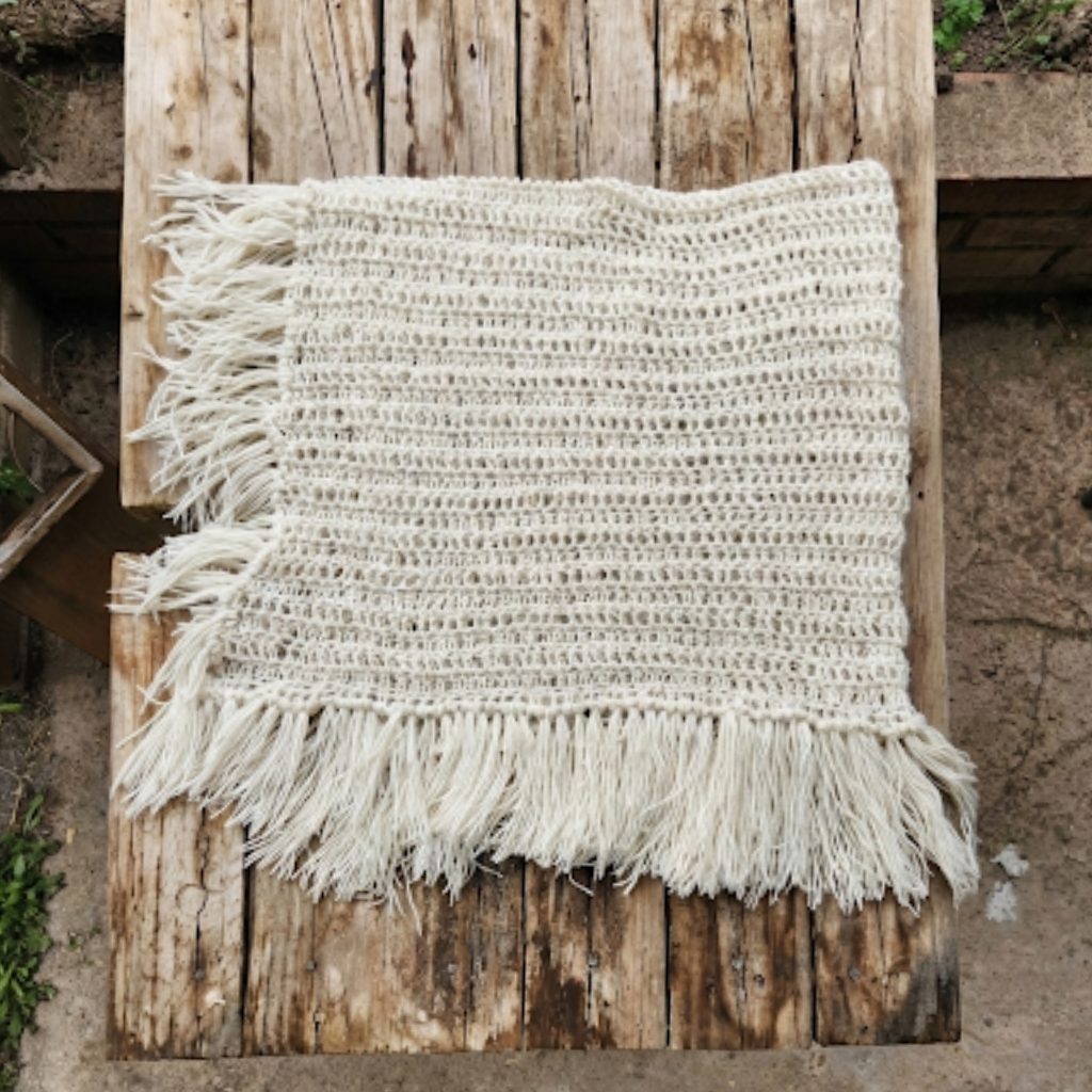Confeccionado enteramente en 100% alpaca, es una pieza que respira: increíblemente liviana pero abrigadora. Su tramado abierto y sus delicados flecos le otorgan un movimiento único, convirtiéndolo en el complemento perfecto para media estación o para esas tardes frescas de verano.