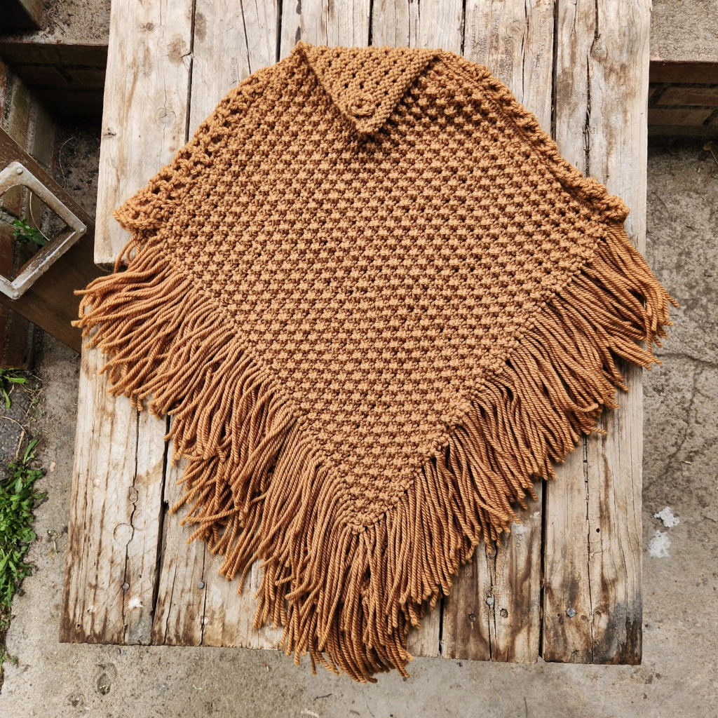 Terminaciones en punta con flecos hechos a mano, cuello con solapa decorativa y hombres con terminación a crochey