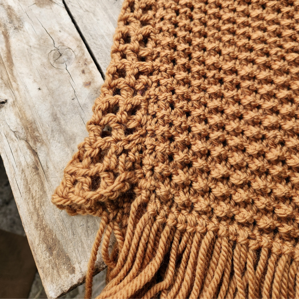 ​Su diseño destaca por un hermoso juego de puntos calados y texturizados que aportan relieve y movimiento a la pieza. El color café tostado es versátil y atemporal, ideal para combinar con cualquier outfit de invierno o media estación. Como detalle final, cuenta con un flequillo largo que le otorga un aire bohemio y elegante.